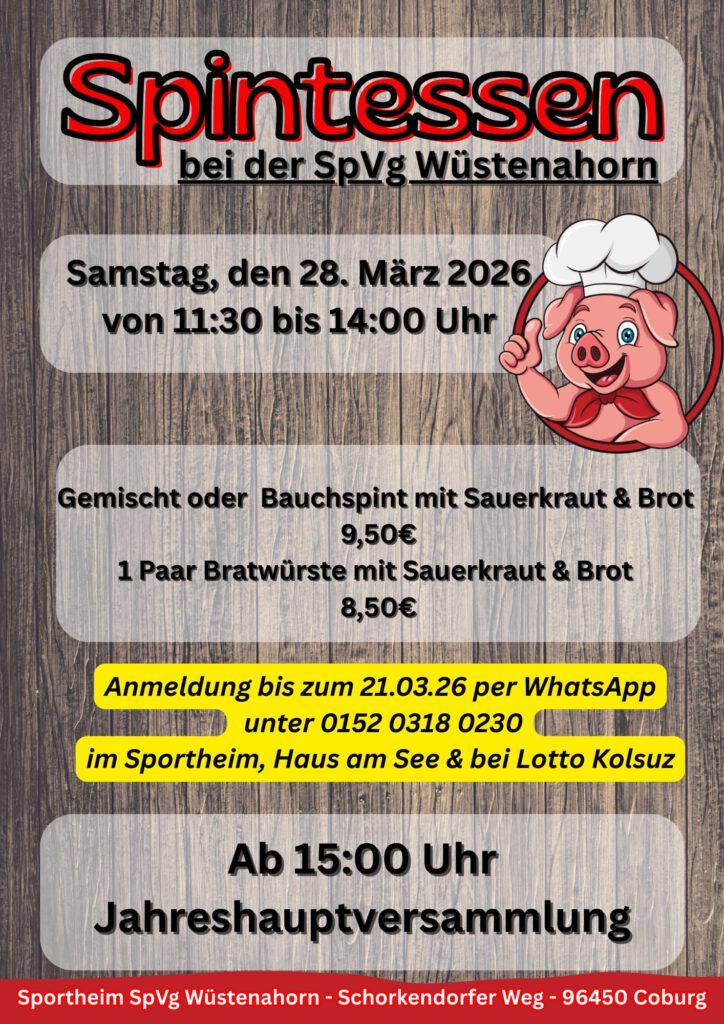 🍖 SPINTESSEN Samstag, 28.03.2026 11:30 Uhr – 14:00 Uhr 🍽️ Unser Angebot * 🥩 Gemischt oder Bauchspint mit Sauerkraut & Brot * 🌭 Bratwürste mit Sauerkraut & Brot 💶 Preise Spint – 9,50 € 1 Paar Bratwürste – 8,50 € 📅